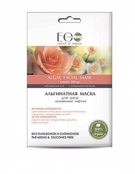 Состав: diatomaceous earth, альгинат, порошок водорослей, экстракт апельсина, спирулина, potassium sulfate, tetrasodium pirophosphate, органическое масло розы, гиалуроновая кислота.