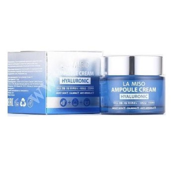 Ампульный крем La miso содержит гиалуроновую кислоту, которая образует на коже защитную пленку, благодаря которой прекращается потеря влаги и нормализуется водный баланс в коже.