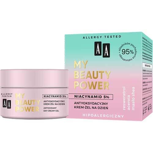 AA MY BEAUTY POWER ДНЕВНЫЙ АНТИОКСИДАТИВНЫЙ КРЕМ НИАЦИНАМИД 5% AA MY BEAUTY POWER - это инновационное сочетание естественной антиоксидантной силы растительных экстрактов и биоактивных молекул: ниацинамида и пептидов, которые одновременно заботятся о здоровье и красоте вашей кожи. Благодаря этой синергии устраняются все недостатки кожи и первые признаки старения. Легкий дневной крем-гель с антиоксидантами поддерживает высокий уровень увлажнения кожи. Действуя как щит против морщин, свободные радикалы не имеют против него никаких шансов! Активные ингредиенты: - Ниацинамид 5% & ndash; эта форма витамина B3 повышает упругость и эластичность, устраняет недостатки и угри, сохраняет влагу в эпидермисе, осветляет изменения цвета и обладает свойствами против морщин. - REZWERATROL & ndash; благодаря своей проколлагеновой активности укрепляет и тонизирует кожу. - Экстракт Ацеролы & ndash; разглаживает кожу и защищает ее от свободных радикалов, делает ее мягкой и осветляет цвет лица. Гипоаллергенный препарат, проверенный на аллергии. Веганский продукт, не испытанный на животных - 95% натуральных ингредиентов.
