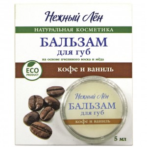 Состав натурального бальзама для губ: пчелиный воск, экстракт кофе, льняное масло, мед, миндальное масло, масло ванили, витамин Е.