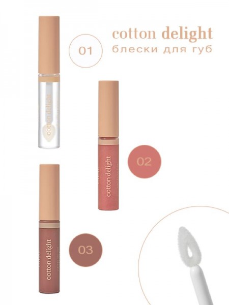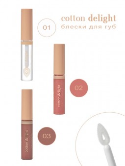 Коллекция блесков для губ Сotton Delight с уникальной веганской формулой c добавлением хлопкового масла, которая ухаживает за губами, интенсивно увлажняя и питая их. Придают максимальный блеск, визуально наполняя губы и создавая эффект оптического увеличения.