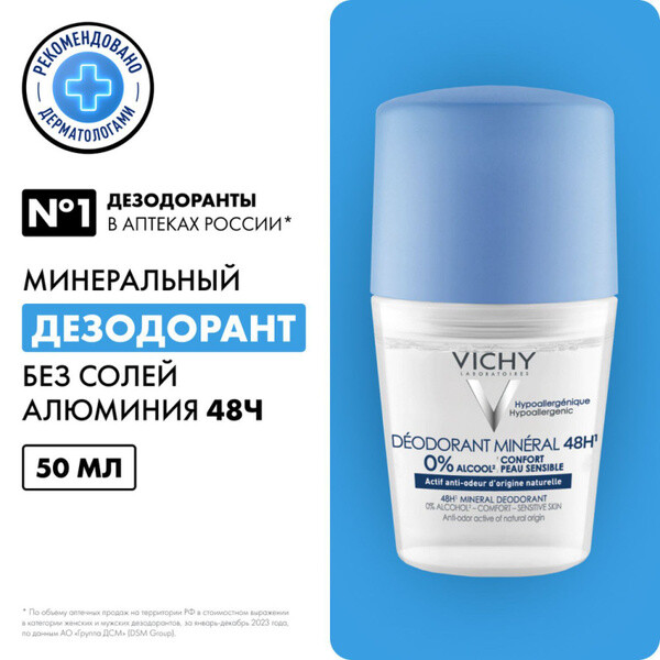 В формуле продукта полностью отсутствуют парабены, соли алюминия и спирт, что позволяет использовать средство на самой чувствительной коже, в том числе у аллергиков, лиц с непереносимостью солей алюминия (а так же просто предубеждением к этому компоненту) и после эпиляции. Но в то же время дезодорант достаточно эффективен. Формула средства основана на минеральных веществах натурального происхождения. В основной состав продукта входят магний (оксид магния очень гигроскопичен и впитывает излишнюю влагу, сохраняя кожу чистой и сухой), кальций (он успокаивает и укрепляет кожу, что актуально после бритья или эпиляции), хлор и гидрокарбонаты (для поддержания кислотно-щелочного баланса тканей) и натрий (увлажняет тонкую кожу). Так же состав дополнен витамином В5 (пантенолом) одним из самых известных заживляющих и успокаивающих компонентов, что делает дезодорант Vichy очень актуальным при порезах и раздражениях в деликатной области подмышечных впадин. В дезодорант в формате шарика дополнительно введен глюконат цинка для нейтрализации неприятного запаха (этот компонент обладает мягким антибактериальным эффектом). Так же, за счет отсутствия солей алюминия, продукт не оставляет на коже и одежде белых разводов.