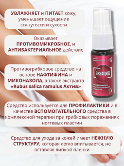 Спрей предназначен для гигиенической и первичной обработки рук, ног и ногтевых пластин, для ухода, защиты и поддержания в нормальном функциональном состоянии кожных покровов, с целью снижения вероятности заболеваний кожи, для устранения запаха стоп после длительного ношения обуви. Снижает вероятность заражения грибковыми заболеваниями при посещении саун, бассейнов, спортзалов, салонов красоты. Уникальный комплекс компонентов имеет фунгицидное и противомикробное действие. Хранить в оригинальной упаковке, при температуре от +5С до +25С. Избегать непосредственного воздействия солнечного света и вблизи отопительных приборов. Состав: Alcohol Denat, Aqua, Rubus Ideaus (Raspberry) Extract,Salix Alba (Willow) Extract,Naftifine Hydrochloride,Miconazole Nitrate.