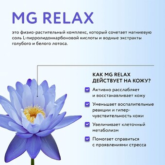 Новая улучшенная формула ночного крема на основе коллагена способствует восстановлению и укреплению тургора кожи, пока вы спите. Коллаген является ключевым компонентом, который помогает улучшить эластичность кожи и предотвратить появление морщин. Комплекс MG Relax содержит магний, воду голубого и орехоносного лотоса, которые помогают снять напряжение и расслабить мышцы лица, что также способствует уменьшению морщин. Витамин Е, масла ши и авокадо являются отличными увлажняющими и питательными ингредиентами, которые помогают улучшить общее состояние кожи, сделать ее мягкой и наполненной. Гиалуроновая кислота в составе крема восстанавливает гидро-липидную мантию и водный баланс, способствует выработке собственного коллагена и эластина. Экстракт зеленого служит защитой от свободных радикалов и препятствует разрушению липидов и белков. Крем подходит для ежедневного применения для всех типов кожи.