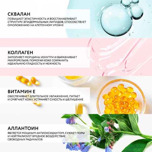 Сыворотка с активными компонентами помогает бороться с признаками старения, мягко увлажняет кожу, делает ее упругой и подтянутой. Укрепляющий компонент — коллаген выравнивает микрорельеф кожи. Сквалан повышает эластичность кожи, способствует разглаживанию мелких морщин, стимулирует антиоксидантные процессы, восстанавливает структуру эпидермиса. Ниацинамид способствует уменьшению пигментации, выравнивает тон кожи, а также стимулируют синтез коллагена и эластина.