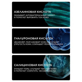 Уникальная* комбинация из трех кислот с комплексным воздействием на несовершенства и текстуру кожи: 10% Азелаиновая кислота + Гиалуроновая кислота + Салициловая кислота.