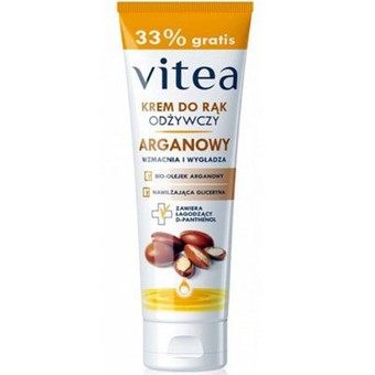 Крем для рук аргановый Vitea arganowy обеспечивает комплексный уход за кожей рук. Аргановое масло добавлено для питания и увлажнения Вашей кожи — кожа становится гладкой и мягкой. Крем богат питательными веществами, моментально впитывается, создавая невидимую пленку, которая защищает кожу рук от неблагоприятного воздействия внешних факторов, таких как моющие средства, ветер, холод, вода.