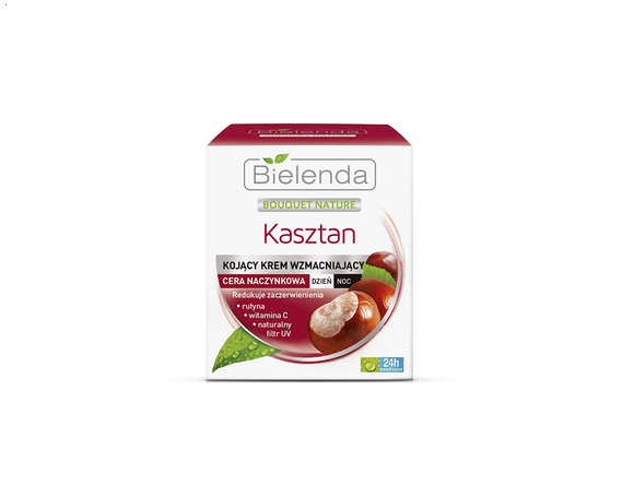 В основе крема – экстракт каштана, богатый витаминами, минералами и антиоксидантами. В комплексе с рутином и витамином С он способствует активному выведению токсинов из клеток и восстановлению, эффективно укрепляет и уплотняет хрупкие стенки сосудов, препятствуя образованию капиллярной сетки, покраснений и раздражений.