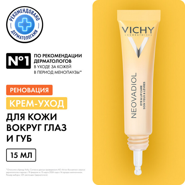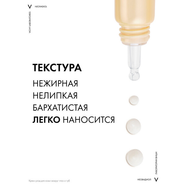 Неовадиол Крем для контура глаз и губ - это первый уход с клинически доказанной эффективностью в борьбе с признаками менопаузального старения кожи вокруг глаз и губ: снижение плотности, морщины. Возвращает коже плотность, заметно разглаживая морщины. Эффективно борется с признаками старения в период менопаузы, благодаря входящим в состав ингредиентам: проксилан, кофеин, гиалуроновая кислота, ниацинамид (витамин В3) и Омега 3-6-9 кислоты.