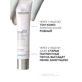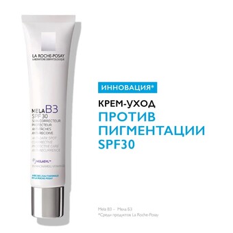 Mela B3 крем-уход против пигментации с SPF 30 борется со всеми видами пигментных пятен и предотвращает их повторное появление. Эффективен против всех видов пигментных пятен, в т.ч. следов постакне и веснушек. Может использоваться как крем от пигментных пятен на руках с защитой от солнца.