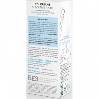 НОВАЯ ЭКСПЕРТИЗА: Микробиом кожи это совокупность миллиардов бактерий, живущих на поверхности кожи. Бактерии помогают регулировать внутренние процессы кожи для поддержания баланса микрофлоры. При повышенной чувствительности кожи важно не только укрепить её защитный барьер, но и нормализовать состав микробиома кожи. Регулировать состав микробиома можно с помощью пребиотиков - комопнентов, которые обеспечивают комфортную среду для дружественных микроорганизмов. Пребиотический уход Toleriane Sensitive Riche не только увлажняет кожу и предотвращает потерю влаги, но и позволяет уменьшить признаки повышенной чувствительности: успокаивает, устраняет ощущение стянутости, возвращает чувство комфорта. БЕЗ ОТДУШЕК, СПИРТА, КРАСИТЕЛЕЙ, ПАРАБЕНОВ, МИНЕРАЛЬНЫХ МАСЕЛ, ЛАНОЛИНА. Высокие стандарты безопасности, свойственные марке La Roche-Posay.