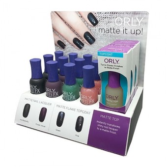 Коллекция лаков ORLY Matte FX Collection for Fall 2013 с матовым финишем, в которой собраны 4 оттенка: два цветных лака с бархатистой текстурой — мерцающий черный и фиолетовый, и два оттенка с розовыми и зелеными частичками, которые можно использовать как верхние покрытия с эффектом матового гранитного рисунка на ногтях.