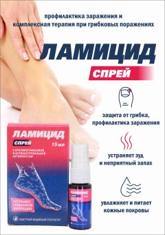 Спрей для ног Ламицид можно рекомендовать пациентам при повышенной потливости ног, для устранения запаха при длительном ношении обуви.