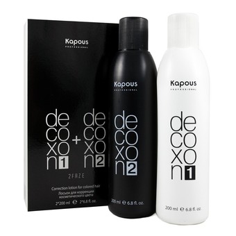 Применение: Перед началом использования средства его следует тщательно встряхнуть. В неметаллической ёмкости смешать "Decoxon" Fase 1 и Fase 2 в пропорции 1:1 до получения однородной массы. Смешивать обе фазы всегда только в равных частях, не допустима замена каким-либо другим препаратом, не использовать по отдельности. Нанести на сухие волосы без предварительного мытья. Время выдержки на волосах - 20 минут с применением тепла. По истечении времени смыть обильным количеством воды, отжать волосы и равномерно нанести на волосы Cremoxon Soft (1.5%) (в наборе Decoxon 2 Faze Kapous нет активатора (оксида), он приобретается отдельно), выдержать 4-6 минут, массируя (не натирать кожу). Если после нанесения Cremoxon Soft волосы обретают прежний нежелательный оттенок, значит искусственный пигмент недостаточно был расстворен в волосах. Вымыть волосы шампунем для всех типов волос Kapous Professional, высушить. При очевидной динамике вымывания цвета процедуру коррекции можно повторять до 3-х раз в день. Применение бальзама и питательных масок между процедурами коррекции цвета не допустимо. Использовать смесь сразу после приготовления.