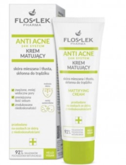 Матирующий крем Flos-Lek Anti-Acne для жирной кожи, склонной к угревой сыпи, матирует кожу, нормализует водно-липидный баланс, регулирует выделение кожного сала. Предотвращает образование новых цветков, обладает вяжущими, антибактериальными, антисеборейными и противовоспалительными свойствами.