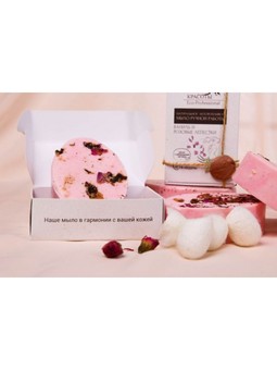 Натриевые соли масел: кокосового, оливкового, виноградной косточки, кукурузного, гелиантуса, артезианская вода, масло гранатовых косточек холодного отжима, пептиды шелковых нитей, лактат натрия, цитрат натрия, лепестки розы, краситель свекольный красный, эфирные масла розы и ванили, витамин Е
