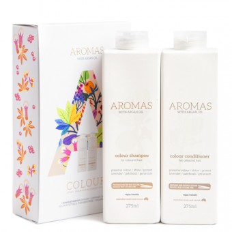 В комплект входят: профессиональный увлажняющий шампунь и кондиционер с аргановым маслом Aromas Colour, 275 мл.