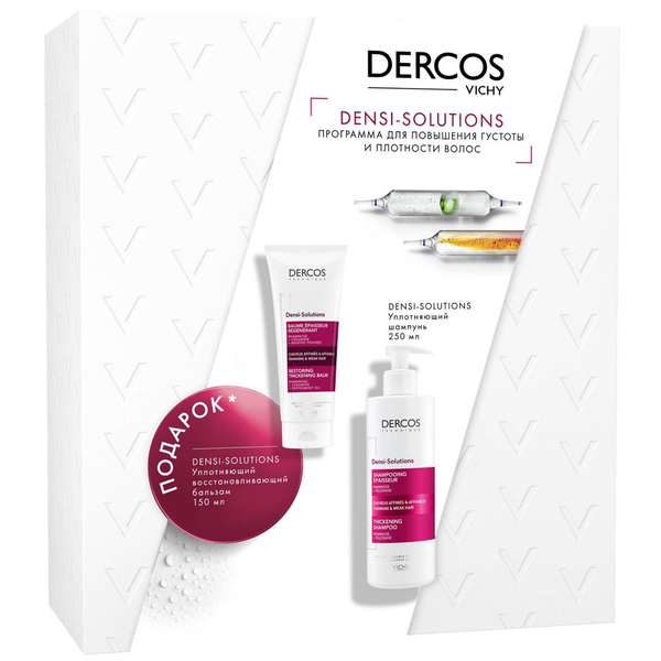 В состав набора входят: Densi-Solutions уплотняющий шампунь 250мл - это инновационная гамма средств по уходу за волосами, которая комплексно борется со всеми аспектами проблемы истончения волос. Уплотняющий шампунь увеличивает массу волос - укрепляет и уплотняет волокно волоса с каждым применением, придавая волосам объем и здоровый вид. Densi-Solutions Восстанавливающий бальзам 200 мл В ПОДАРОК - увеличивает массу волос. Он укрепляет и уплотняет волокно волоса с каждым применением, придавая волосам объем и здоровый вид. СПОСОБ ПРИМЕНЕНИЯ:Нанесите бальзам на кожу головы и влажные волосы. Помассируйте нежными движениями и смойте. Повторите процедуру, чтобы усилить воздействие средства на корни волос. ЭФФЕКТИВНОСТЬ: После первого применения: +40% объема при использовании только шампуня, +62% объема при сочетанном использовании шампуня и бальзама Densi-Solutions. В 3,8 раза больше блеска при сочетанном использовании шампуня и бальзама Densi-Solutions.