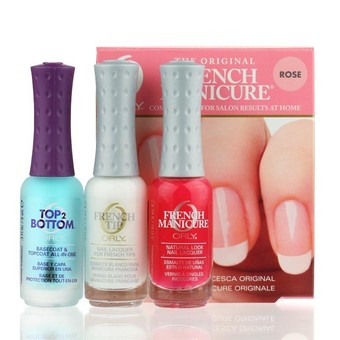 Комплект включает в себя базовое и верхнее покрытие 2 в 1 Top2Bottom, лак для основного тона Bare Rose French Manicure и лак French Top White Tips, созданный специально для аккуратной прорисовки линии улыбки, трафареты для французского маникюра.