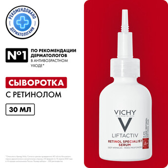 Инновация от VICHY: новая сыворотка RETINOL SPECIALIST ДЛЯ КОРРЕКЦИИ ГЛУБОКИХ МОРЩИН обогащена 0,2% чистым ретинолом усиленным фракциями пробиотика и био-пептидами для интенсивного антивозрастного действия. Борется со всеми типам морщин, даже с глубокими.