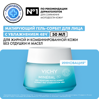 Инновация* VICHY: впервые* Лаборатории VICHY объединили в одной формуле необходимые для кожи компоненты в освежающем матирующем геле, который обеспечивает видимый контроль жирности в течение дня. Кожа мгновенно становится матовой, видимость пор заметно сокращается. Гель-сорбет помимо матирования кожи обеспечивает длительное увлажнение на 48 часов**. Разработан специально для жирной и комбинированной кожи лица.
