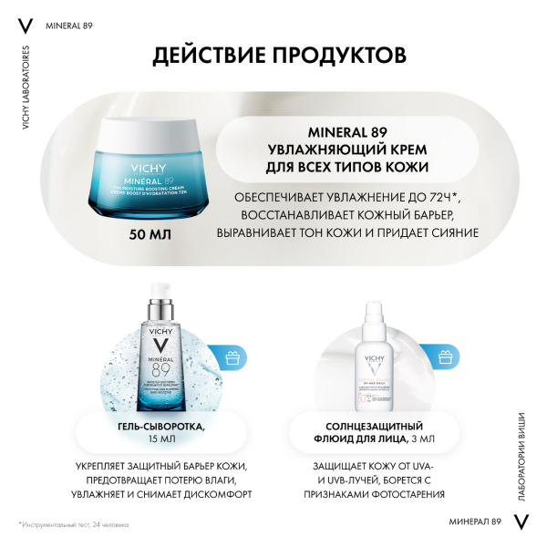 1. VICHY MINERAL 89 Интенсивно увлажняющий крем. Обеспечивает длительное увлажнение до 72 часов для всех типов кожи. 50мл Восстанавливает и укрепляет кожный барьер. Придает коже сияние и выравнивает её тон.