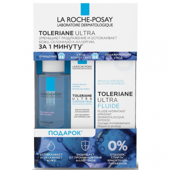 Промо-набор для комплексного ухода за сверхчувствительной и склонной к аллергии кожи. Уход Toleriane Ulra Fluid уменьшает раздражение и успокаивает кожу за 1 минуту. Мицеллярная вода Ultra для чувствительной и склонной к аллергии кожи: • Тщательно очищает кожу от загрязнений, снимает макияж с лица и глаз, уменьшает покраснения и чувство стянутости. • Не требует смывания водой. Уход Toleriane Ultra Легкий Флюид: • Моментально успокаивает, восстанавлиает, защищает кожу • Подходит для чувствительной и склонной к аллергии кожи нормального и/или комбинированного типа. Уход за кожей вокруг глаз Toleriane Ultra Eye Contour: • Уменьшает дискофморт и припухлость кожи вокруг глаз • Интенсивно увлажняет и уменьшает покраснения. В ПОДАРОК - Мицеллярная вода Ultra для сверхчувствительной и склонной к аллергии кожи 50 мл - очищает кожу и снимает макияж, даже с глаз; В ПОДАРОК - Уход для контура глаз Toleriane Ultra 2 мл - уменьшает дискомфорт и припухлость.
