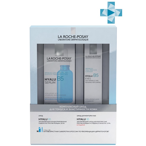 Концентрированная сыворотка La Roche-Posay Hyalu B5 против морщин: AQUA/WATER, GLYCERIN, ALCOHOL DENAT., PROPYLENE GLYCOL, PANTHENOL, PENTYLENE GLYCOL, DIMETHICONE, PEG-6 CAPRYLIC/CAPRIC GLYCERIDES, PPG-6-DECYLTETRADECETH-30, GLYCERYL ISOSTEARATE, MADECASSOSIDE, SODIUM HYALURONATE, AMMONIUM POLYACRYLOYLDIMETHYL TAURATE, DISODIUM EDTA, HYDROLYZED HYALURONIC ACID, CAPRYLYL GLYCOL, CITRIC ACID, XANTHAN GUM, BUTYLENE GLYCOL, TOCOPHEROL, PHENOXYETHANOL, PARFUM /FRAGRANCE. Уход для контура глаз La Roche-Posay Hyalu B5 против морщин и следов усталости: AQUA/WATER, GLYCERIN, BUTYROSPERMUM PARKII BUTTER/SHEA BUTTER, DIMETHICONE, PRUNUS ARMENIACA KERNEL OIL/APRICOT KERNEL OIL, PENTAERYTHRITYL TETRAETHYLHEXANOATE, PANTHENOL, SILICA, ISOHEXADECANE, ZEA MAYS STARCH/CORN STARCH, PROPYLENE GLYCOL HYDROXYPROPYL TETRAHYDROPYRANTRIOL, CERA ALBA/BEESWAX, STEARIC ACID, PALMITIC ACID, PEG-100 STEARATE, GLYCERYL STEARATE, PEG-20 STEARATE, STEARYL ALCOHOL, TIN OXIDE, BIS-PEG-18 METHYL ETHER DIMETHYL SILANE, SORBITAN OLEATE, DIMETHICONOL, SODIUM HYALURONATE, ARGININE PCA, SERINE, MYRISTIC ACID, ALUMINA, DISODIUM EDTA, ISOPROPYL TITANIUM TRIISOSTEARATE, HYDROLYZED HYALURONIC ACID, HYDROLYZED LINSEED EXTRACT, CITRIC ACID, ACETYL DIPEPTIDE-1 CETYL ESTER, TOLUENE SULFONIC ACID,POLYSORBATE 80, ACRYLAMIDE/SODIUM ACRYLOYLDIMETHYLTAURATE COPOLYMER, BHT, PENTAERYTHRITYL TETRA-DI-T-BUTYL HYDROXYHYDROCINNAMATE, SODIUM BENZOATE, PHENOXYETHANOL, BENZOIC ACID
