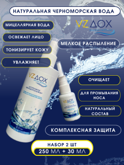 «VZДОХ» – натуральный спрей из морской воды Черного моря, очищенной по собственной, уникальной технологии. Природный источник здоровья и красоты. «VZДОХ» создан для профилактики ОРВИ, коронавируса, кожных заболеваний для взрослых и детей; аналог «Аква Мариса», «Аква Лора». Природная фильтрованная морская вода Чёрного моря без консервантов и аэрозольных пропелленов. В состав спрея входят более 64 микроэлементов естественная солёность Черноморской воды – 13-17 г на 1 л. Комплект в коробке: 250 мл спрей + 30 мл назальный спрей. Для ежедневного косметического ухода за слизистыми оболочками. Для профилактики простудных заболеваний, ОРВИ, коронавирусной инфекции, акне, кожных заболеваний (диатез, дерматит, псориаз). Назальный спрей для промывания носа можно использовать для детей и взрослых. Морская вода для носа - безопасное и эффективное средство. Спрей для лица эффективен от прыщей и глубоко увлажняет кожу.