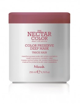 Nook The Nectar Color/Color Preserve Deep Mask Thick Hair - маска «Стойкость цвета» для жестких и плотных волос. Предназначен для ухода за окрашенными локонами, поддержания насыщенности их цвета. Проникая глубоко в структуру локонов, маска увлажняет и питает их, оказывает смягчающее действие, делая пряди более послушными, активизирует процессы регенерации. Препятствует вымыванию цветного пигмента, уплотняет волосяные кутикулы, делает пряди более устойчивыми к воздействию вредных внешних факторов и придает им естественный блеск