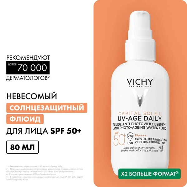 Более 80% признаков старения кожи вызваны ежедневным воздействием инфракрасного излучения и негативных факторов окружающей среды. Невесомый солнцезащитный флюид UV-AGE DAILY обеспечивает очень высокую степень UVA- и UVB-защиты благодаря системе UV-фильтров SPF50+, PA++++ (UVA-PF 46). Инновационная формула* средства, усиленная вулканической термальной водой VICHY, пробиотической фракцией, пептидом и ниацинамидом, защищает от признаков фотостарения кожи – снижения эластичности, пигментации и преждевременных морщин. Запатентованная технология Netlock создает на поверхности кожи невесомое и невидимое покрытие. Легкая нелипкая текстура флюида не ощущается на коже и устойчива к поту. Протестировано под дерматологическим и офтальмологическим контролем. Гипоаллергенно. Подходит для чувствительной кожи. Не раздражает слизистую глаз.