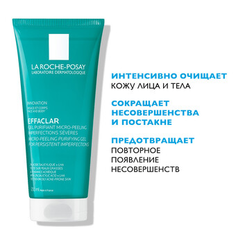 ИНТЕНСИВНОЕ ОЧИЩЕНИЕ ПРОБЛЕМНОЙ КОЖИ С ВЫРАЖЕННЫМИ НЕСОВЕРШЕНСТВАМИ. Для лица и тела. Протестировано на коже, склонной к акне. EFFACLAR Микроотшелушивающий гель интенсивно очищает кожу и поры от загрязнений, сокращает несовершенства, удаляет избыток кожного сала, оставляя кожу заметно более чистой и свежей. Формула с салициловой и липо-гидрокси-кислотой (LHA) обеспечивает микроотшелушивающий эффект без трения. Помогает сократить число выраженных несовершенств (-51%) и постакне (-57%). Клинически доказанная эффективность против повторного появления несовершенств. Подходит для лица и тела. Физиологический pH - Не содержит спирта.