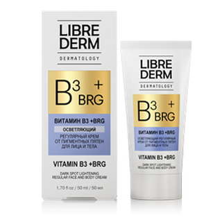 Крем для лица и тела BRG + ВИТАМИН В3 LIBREDERM® помогает поддерживать и продлевать эффект осветления пигментных пятен после интенсивных процедур устранения пигментных пятен. Крем позволяет контролировать воспалительные процессы, уменьшая покраснения, защищает клеточную ДНК от УФ-излучений, оказывает антиоксидантную защиту клеток. Благодаря биоактиву в составе сыворотки содержание меланина в области гиперпигментации сокращается на 31%*, выравнивается тон кожи. * подтверждено тестами in vitro.