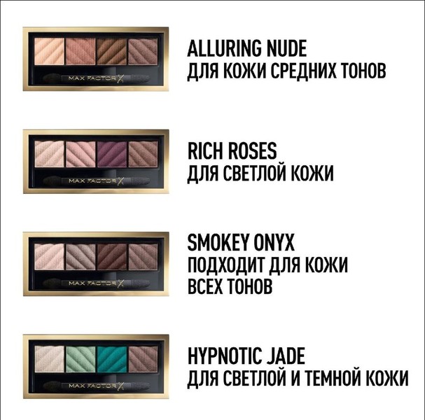 Обновите свой сезонный образ с супер матовыми и подчеркнутыми бровями при помощи набора Max Factor Smokey Eye Matte Drama Kit. Измените свой образ за 4 простых шага, при помощи одной палитры. Формула: Набор Max Factor Smokey Eye Matte Drama Kit предназначен для интенсивного усиления цвета ваших глаз — все, что вам нужно сделать, это выбрать идеальный оттенок для вашего цвета глаз и кожи. Глубокие матовые пигменты сочетающихся оттенков и тени для бровей для создания идеального эффекта «smokey eyes».