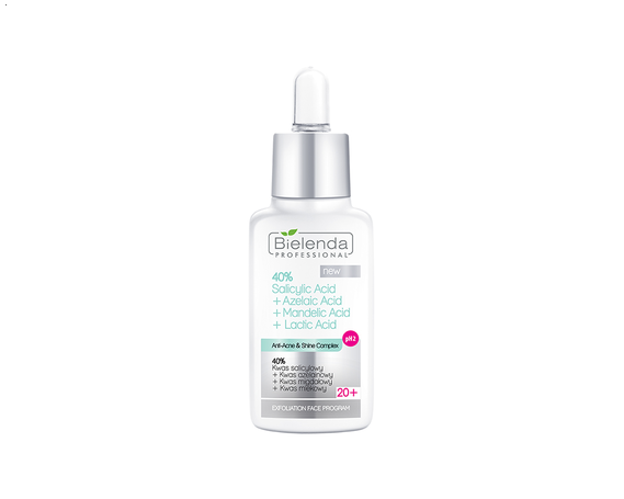 Глубокую очистку кожи жирного и комбинированного типов обеспечит 40% пилинг Exfoliation Face Program Anti Acne с салициловой кислотой + азелаиновой кислотой + миндальной кислотой + молочной кислотой. Входящие в состав средства активные компоненты отлично удаляют загрязнения, а также ороговевшие частички эпидермиса, глубоко очищают поры и сужают их. Также они оказывают мощное антибактериальное и противовоспалительное действия, борясь с угревой сыпью и различными высыпаниями, подавляют выработку меланина, уменьшая нежелательную пигментацию и количество мимических морщин, тонизируют и увлажняют кожный покров, значительно улучшая его состояние.