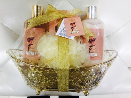 Ажурная корзинка с атласной лентой, Гель для душа 270 мл, Лосьон для тела 270 мл, Кристаллическая соль для ванн 100 г, Мочалка 1 шт.