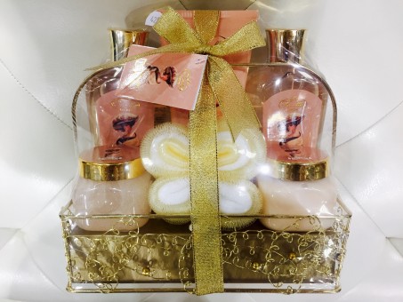 Металлическая корзинка с бусинками, Гель для душа 220 мл, Лосьон для тела 180 мл, Пена для ванн 220 мл, Скраб для тела 100 мл, Крем для тела 100 мл, Мочалка в форме бабочки 1 шт