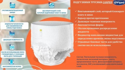 Состав продукта : Текстильная тыльная поверхность, нетканый материал, прорезиненная часть, фиксирующий материал, полиэтилен, SAP, усиливающий дополнительный слой, фиксирующий лента.