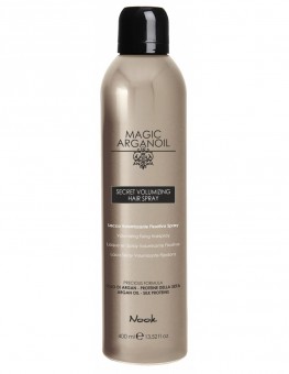 Лак для волос с эффектом объема Magic Arganoil Secret Volumizing Hair Spray от Nook закрепляет укладку, не утяжеляет волосы, обеспечивает объем и блеск. Его формула содержит аргановое масло, протеины шелка и УФ-фильтры. Лак покрывает волосы специальной пленкой, защищающей укладку от влаги. УФ-фильтры защищают волосы от выгорания, пересушивания и повреждения под воздействием активного солнечного излучения.