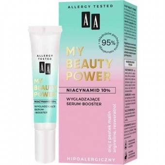 AA MY BEAUTY POWER NIACYNAMID 10% Разглаживающая сыворотка-бустер 15 мл. AA MY BEAUTY POWER - это инновационное сочетание естественной антиоксидантной силы растительных экстрактов и биоактивных молекул: ниацинамида и пептидов, которые одновременно заботятся о здоровье и красоте вашей кожи. Благодаря этой синергии устраняются все недостатки кожи и первые признаки старения. Разглаживающая сыворотка-бустер направляет всю свою силу на устранение недостатков и первых морщин, а также на стимулирование внутренней энергии вашей кожи. Активные ингредиенты: - Ниацинамид 10% - эта форма витамина B3 повышает упругость и эластичность, устраняет дефекты и угри, сохраняет влагу в эпидермисе, осветляет пигментные пятна и обладает свойствами против морщин. - Аргирелин - нейропептид, расслабляющий микромышцы кожи и разглаживающий мимические морщинки. - Малина - делает кожу эластичной и восстанавливает микроповреждения эпидермиса. - Резвератрол - благодаря своей проколлагеновой активности укрепляет и тонизирует кожу. Гипоаллергенный препарат, проверенный на аллергии. Веганский продукт, не испытанный на животных - 95% натуральных ингредиентов.