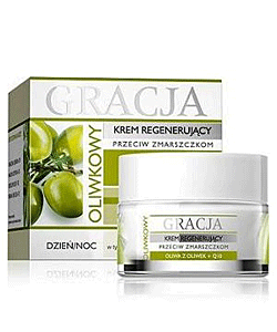 Регенерирующий крем против морщин Оливковое масло + Коэнзим Q10 Miraculum Gracja, предназначен для ежедневного ухода за лицом, зоной вокруг глаз и декольте. Рекомендуется для всех видов кожи, в том числе для сухой кожи, склонной к раздражению, утратившей упругость и эластичность. Содержит оливковое масло, коэнзим Q10, виноградное масло, Lipogard™, которые противодействуют накоплению токсинов, хорошо увлажняют и восстанавливают кожу.