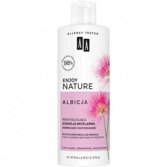 A ENJOY NATURE восстанавливающая мицеллярная эссенция для снятия макияжа и очищения 400 мл. AA ENJOY NATURE - это идеально подобранный натуральный уход, отвечающий потребностям вашей кожи! Используя силу эффективных растительных экстрактов, мы создали уникальную гипоаллергенную формулу восстанавливающей мицеллярной эссенции, которая обеспечит эффективное удаление макияжа и очищение кожи, а также увлажняет и успокаивает сухую, склонную к капиллярам и раздражению кожу. Действие активных ингредиентов: - Silky Albice & ndash; оживляет кожу, уменьшает потерю воды эпидермисом и укрепляет кровеносные сосуды. - Сок листьев алоэ & ndash; стимулирует регенеративные процессы, регулирует уровень увлажнения и снимает раздражения. - Пантенол & ndash; связывает воду в эпидермисе, глубоко увлажняя. Уменьшает покраснение и раздражение. pH безопасен для области вокруг глаз. Дерматологически протестирован на людях с аллергическими кожными заболеваниями. Не содержит краситель. Не содержит отдушек. pH нейтральный для кожи. 98% ингредиентов натурального происхождения. Гипоаллергенен.