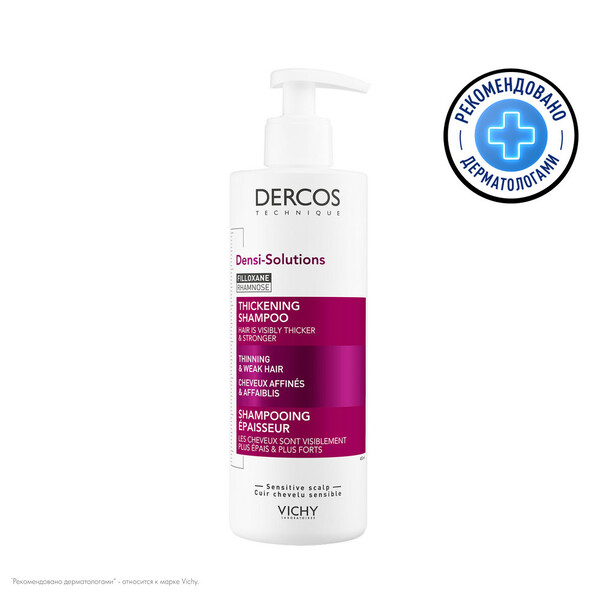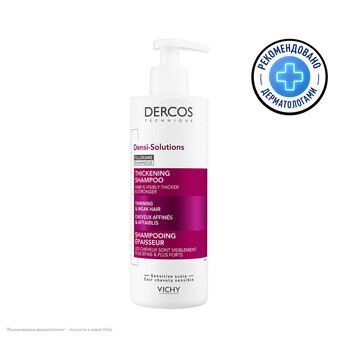 Наши волосы хранят в себе следы негативных воздействий, которым они когдалибо подвергались. Качество волос страдает как от внешних факторов горячей укладки, ультрафиолета, холода или неправильного ухода, так и от внутренних изменений стресса, гормональных колебаний. Все это может привести к нарушению структуры волокна волоса, переходу части фолликулов в фазу покоя. Стержни волос истончаются, становятся менее прочными и упругими, в результате, прическа теряет объем и густоту. Верните лучшее время Ваших волос с DERCOS DENSI-SOLUTIONS. Волосы более густые, плотные и крепкие. Эксперты Лабораторий VICHY разработали инновационную гамму средств по уходу за волосами, которая комплексно борется со всеми аспектами проблемы истончения волос. Сыворотка увеличивает количество волос, шампунь повышает плотность, а бальзам восстанавливает структуру волос. Уплотняющий шампунь Dercos Densi-Solutions увеличивает массу волос. Он укрепляет и уплотняет волокно волоса с каждым применением, придавая волосам объем и здоровый вид.