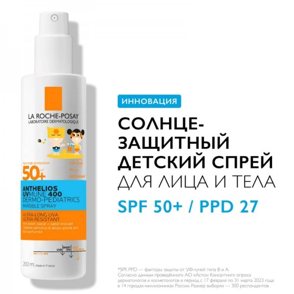 Невидимый солнцезащитный детский спрей для лица и тела Антгелиос UVMUNE 400 - результат более 10 лет исследований. Первый фильтр среди продуктов La Roche-Posay, защищающий от ультрадлинных УФ-лучей. Очень высокая степень защиты от широкого спектра UV-лучей. Специально разработанная формула для нежной и чувствительной кожи детей. Подходит для кожи, склонной к атопии. Легкая, невидимая на коже текстура. Не оставляет белых следов. Без отдушки.