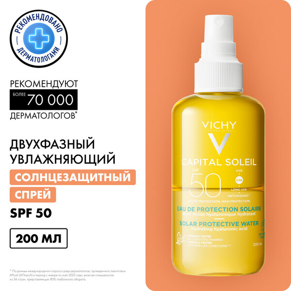 СОЛНЦЕЗАЩИТНАЯ ВОДА ОТ VICHY - ТЕПЕРЬ С SPF50 Средство с очень высокой защитой от UVA-и UVB-лучей в инновационной* текстуре воды. Лёгкая двухфазная формула с [ГИАЛУРОНОВОЙ КИСЛОТОЙ] и [МИНЕРАЛИЗИРУЮЩЕЙ ТЕРМАЛЬНОЙ ВОДОЙ VICHY] укрепляет защитный барьер кожи и обеспечивает 8 часов интенсивного увлажнения**, оставляя на коже легкий бархатистый финиш. Легко наносится и быстро впитывается. Обладает нелипкой текстурой. Подходит для всех типов кожи, даже для чувствительной. Гипоаллергенно. Протестировано под контролем дерматологов. -ОБЕСПЕЧИВАЕТ НАДЕЖНУЮ ЗАЩИТУ UVA+UVB -УВЛАЖНЯЕТ КОЖУ -ВОДОСТОЙКИЙ. УСТОЙЧИВ К ПЕСКУ -ГИПОАЛЛЕРГЕННО Доказанная эффективность 8Ч УВЛАЖНЕНИЯ** *Среди продуктов VICHY **Инструментальный тест, 52 участника