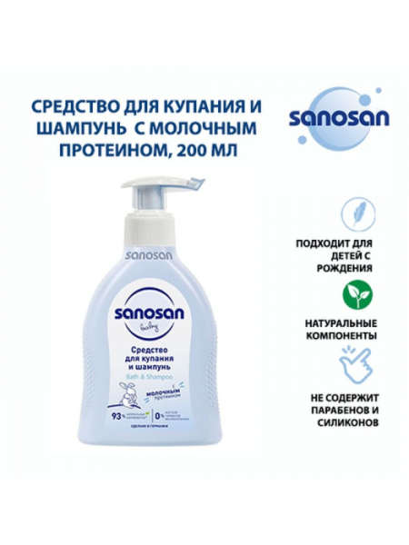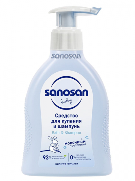 Средство для купания и шампунь Sanosan содержит натуральные экстракты трав. С помощью специально подобранных мягких моющих компонентов растительного происхождения он бережно очищает нежную кожу и тонкие волосы малыша. Средство подойдет для детей с рождения. Благодаря питательным добавкам, таким как оливковое масло и молочный протеин, кожа не будет пересушиваться. Мягкая формула не раздражает глазки. Подходит детям с сухой и очень чувствительной кожей.