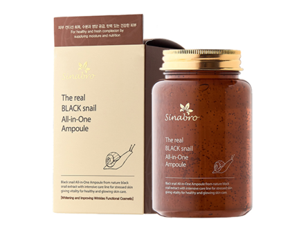 Функциональная ампульная сыворотка с экстрактом настоящей Черной улитки SINABRO The real BLACK snail All-in-One Ampoule способствует устранению морщин и придает коже сияние. Сыворотка Все-В-Одном с экстрактом настоящей черной улитки создана для восстановления поврежденной кожи: она придает жизненные силы, делая ее здоровой и красивой.