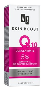 AA Skin Boost Q10 концентрат 5% коэнзим Q10 + экстракт биомассы AA Skin Boost с коэнзимом Q10 и экстрактом из BIO малины является активным лечением, которое замедляет старение, усиливая эффект кремов для ежедневного ухода за кожей. Активный коэнзим Q10 является естественным строительным материалом кожи, стимулирует рост и регенерацию клеток и замедляет процесс старения. Он ингибирует деградацию гиалуроновой кислоты в коже и противодействует расщеплению коллагена под воздействием УФ-излучения. Экстракт BIO-малины разглаживает кожу, придает ей сияющий вид и защищает от вредного воздействия свободных радикалов.