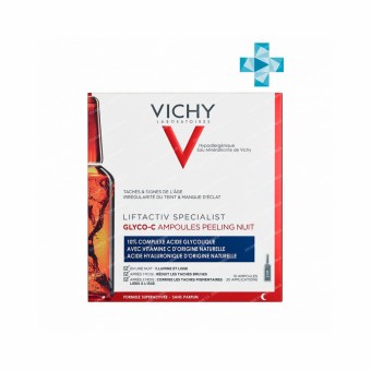 Лаборатории VICHY представляют инновацию – Liftactiv Specialist GLYCO-C сыворотка в ампулах для вечернего применения. Благодаря высокому содержанию высокоэффективных ингредиентов Liftactiv Specialist GLYCO-C возвращает естественное сияние коже, улучшает ее тон и борется с пигментацией. Сыворотка-пилинг работает пока вы спите. Бережная формула деликатно отшелушивает и увлажняет кожу. Герметичная безвоздушная среда ампулы, защищает активные ингредиенты от окисления и позволяет сохранить минималистичный состав сыворотки – всего 12 ингредиентов. Формат ампулы и удобный аппликатор обеспечивают оптимальную дозировку для эффективного применения. Кожа лица заметно более сияющая и разглаженная, тон кожи заметно более ровный, пигментные пятна менее выражены. Доказанные видимые результаты: За 1 ночь: кожа заметно более гладкая и сияющая. Через 1 неделю: Тон кожи видимо более ровный. Спустя 2 месяца применения: Пигментные пятна менее выражены.