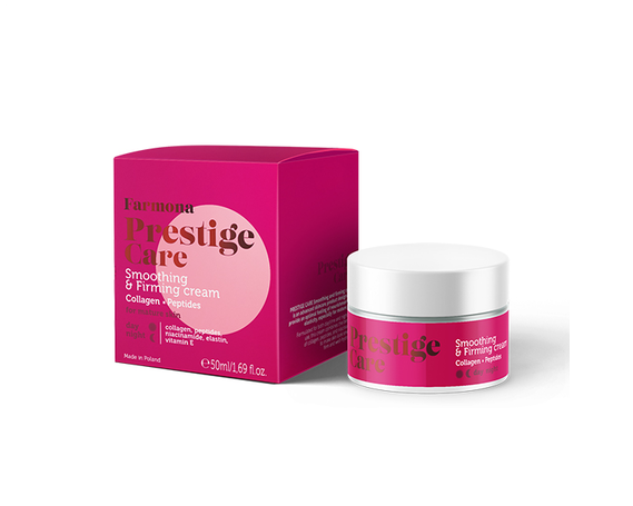 Омолаживающий крем Farmona Prestige Care Smoothing and Firming Day/Night Cream на основе пептидов и коллагена эффективно укрепляет кожу, разглаживает, питает и увлажняет. Крем способствует устранению дряблости и провисания кожи, обеспечивает длительное увлажнение, смягчает, замедляет появление возрастных изменений, разглаживает мелкие морщинки и уменьшает глубину крупных заломов. Средство повышает эластичность и упругость кожи, освежает, выравнивает тон лица, придает свежесть.
